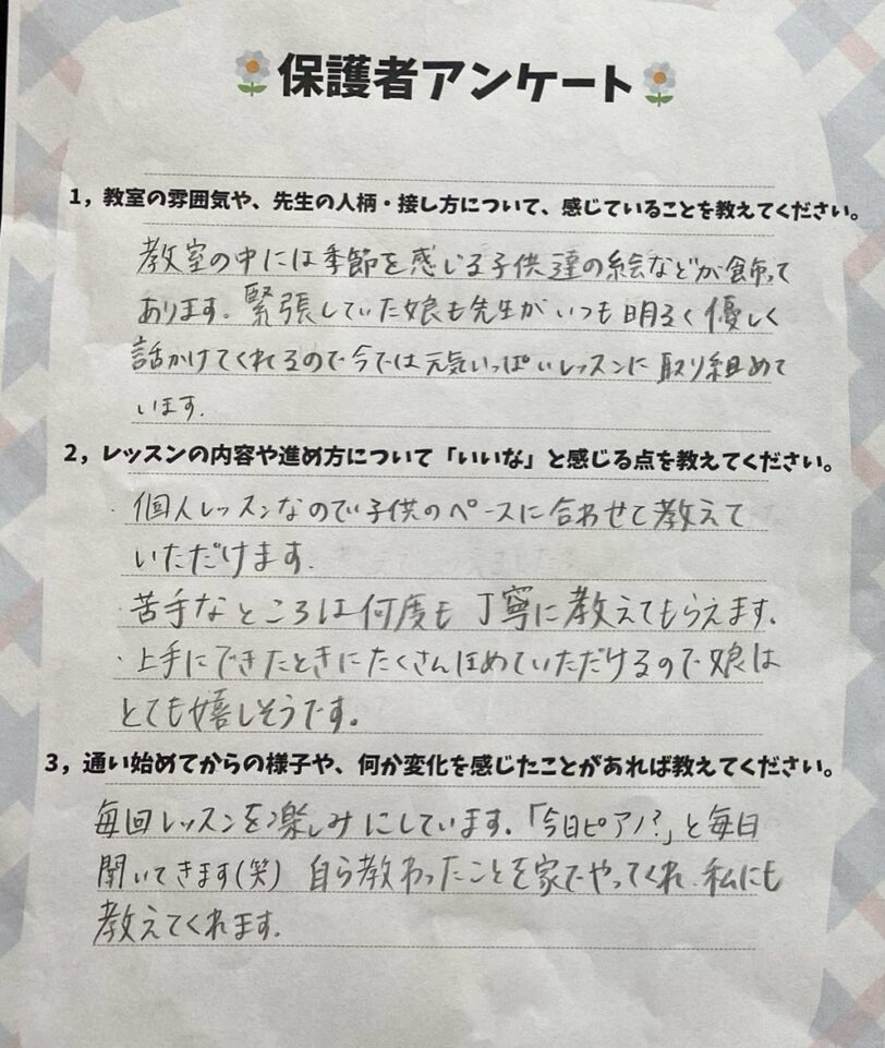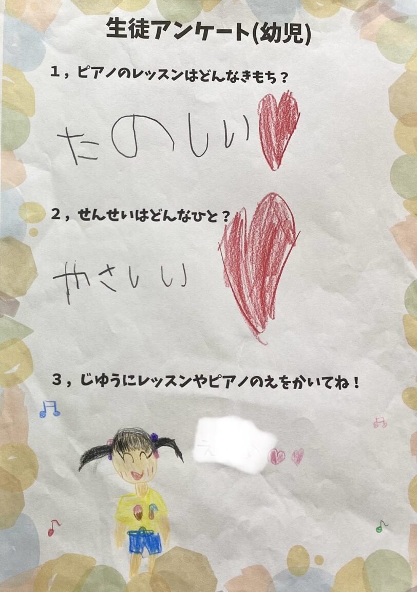 【教室アンケート紹介④】通い始めて半年、「今日ピアノ?」と毎日楽しみにしてくれているEちゃん(年長)とお母さまより🌸