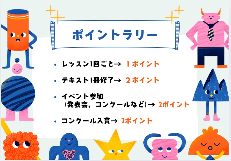 ・イベント参加(発表会・コンクールなど) → 2ポイント コンクール入賞 → 2ポイント
